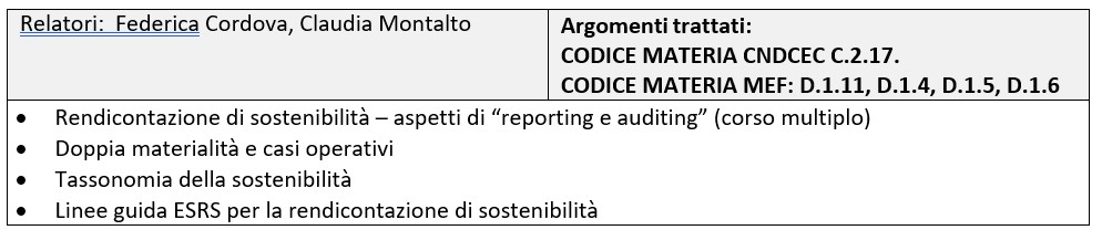 In ottemperanza all’articolo 18, comma 4 del D.lgs. 125/2024, il corso consente di acquisire i crediti formativi nelle materie caratterizzanti la rendicontazione e la attestazione della sostenibilità (ai sensi dell’articolo 5 del decreto legislativo n. 39 del 2010), con specifico riferimento agli argomenti appartenenti al Gruppo “D” del programma di formazione continua e aggiornamento professionale elaborato dal MEF per il 2024 e per il 2025, necessari per poter presentare domanda di abilitazione al Ministero dell’economia e delle finanze con le modalità di cui al D.M. 19 febbraio 2025.